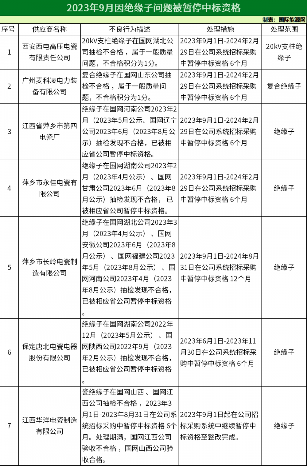 西安西电高压电瓷有限责任公司:20kV支柱绝缘子在国网湖北公司抽检不合格,属于一般质量问题,不合格积分为1分,被暂停中标资格 6个月;