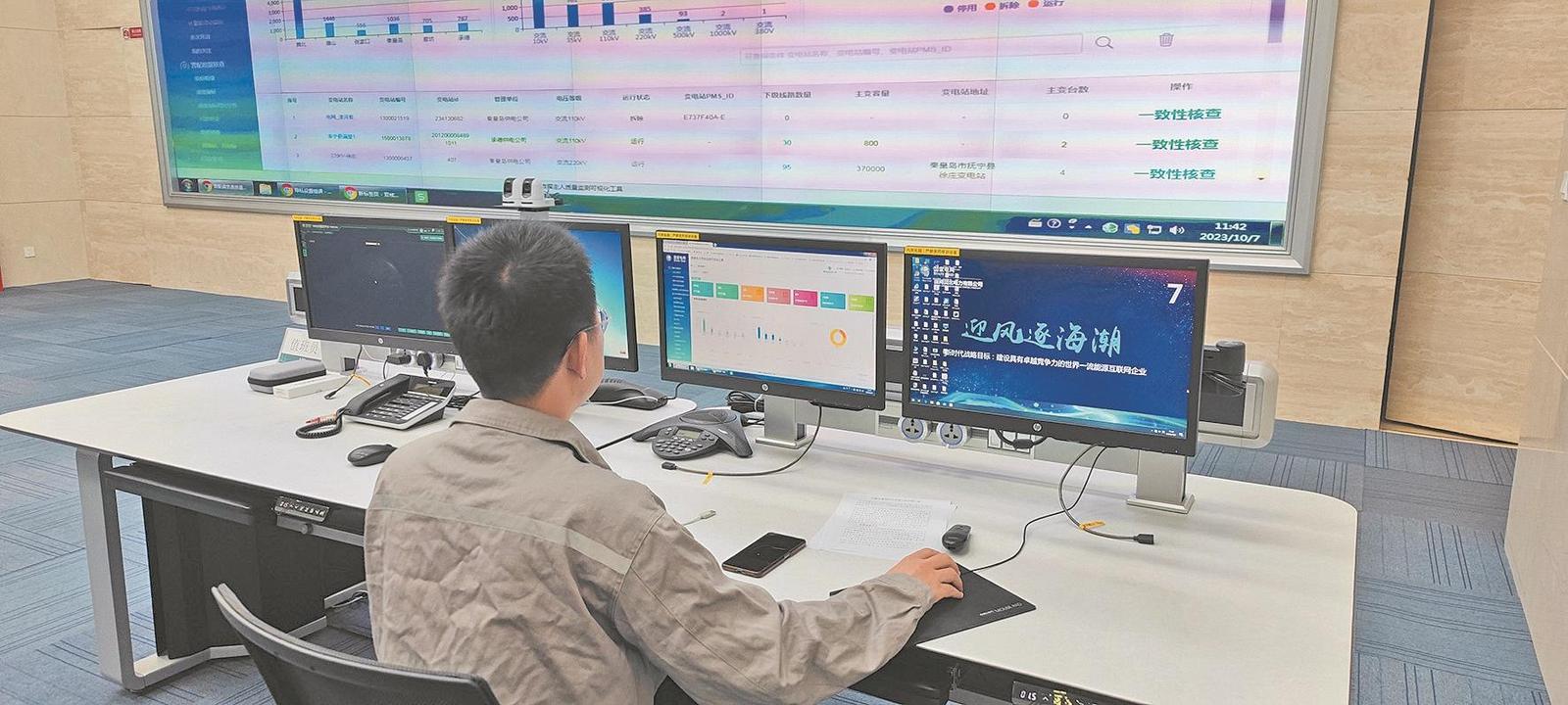 国网冀北智能配网中心值班人员通过营配贯通数据可视化平台监测设备运行情况。 王冲 摄