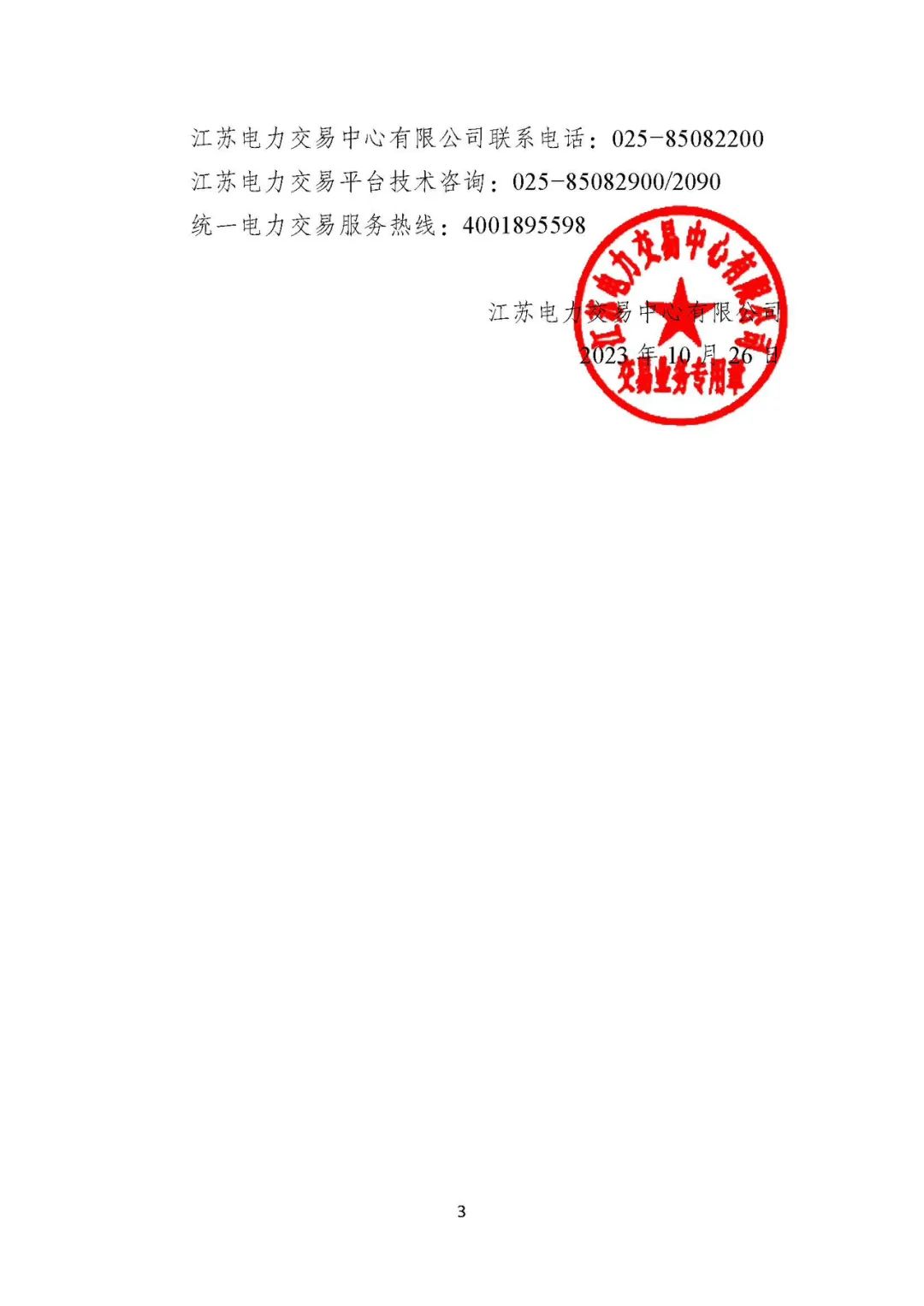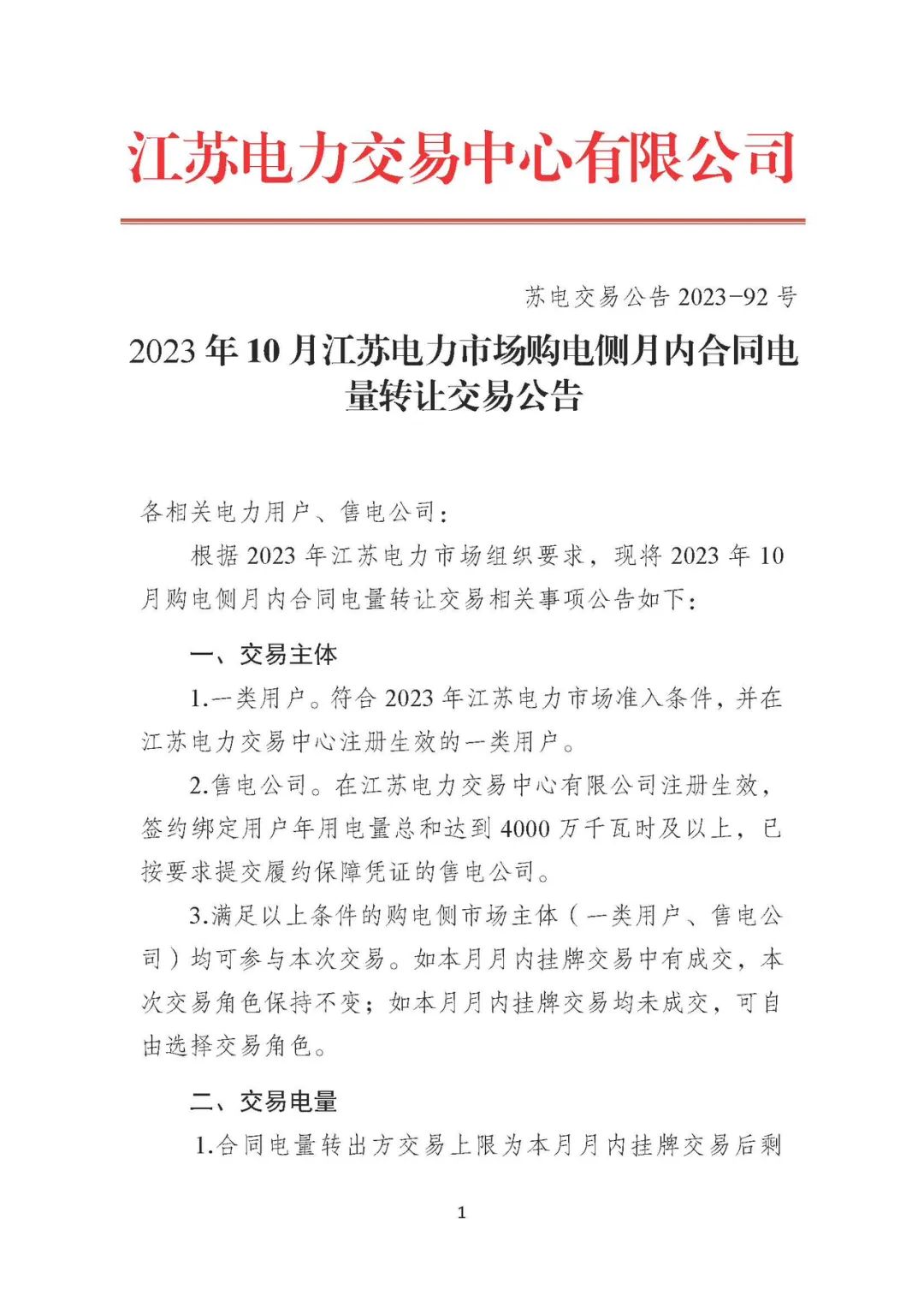 2023年10月江苏电力市场购电侧月内合同电量转让交易公告