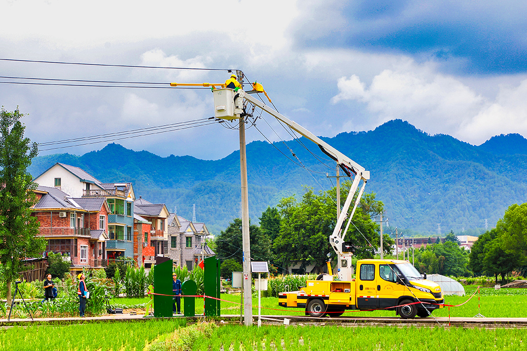2023年6月20日,在杭州临安太阳镇高拔村一处水稻田旁,临安地区第一辆无支腿绝缘斗臂车完成了“首秀”。只见一名带电作业工在无支腿绝缘斗臂车的协助下缓缓升向半空中,对10千伏双庙线高拔扶善支线熔断器进行带电断接引流线。