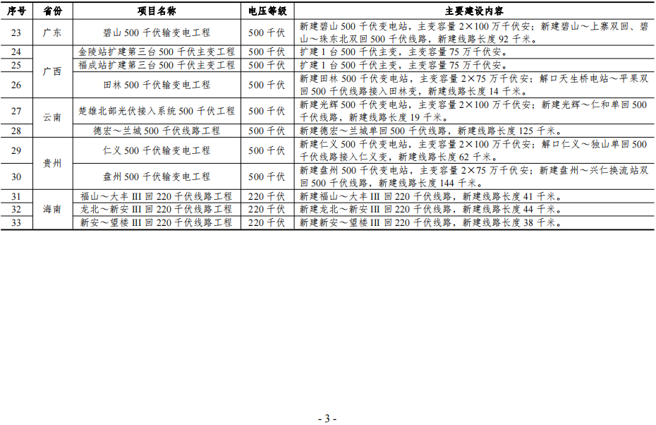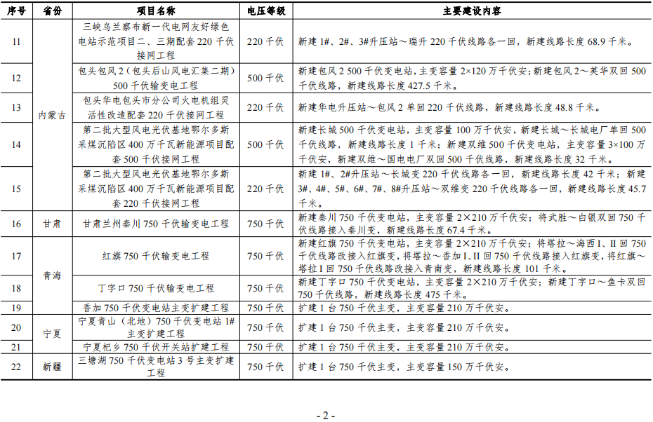 在2024年开工的新能源配套电网重点项目中,包含2个1000千伏电网项目、3个±800千伏电网项目、7个750千伏电网项目22个500千伏电网项目、3个220千伏电网项目。