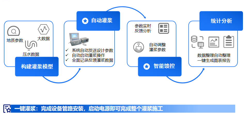 智能灌浆基于岩体结构力学、地下水动力学等理论解析地质特性和渗流规律,结合数值模拟和人工智能技术,研究建立灌浆预测模型,建立集“钻-制-输-配-灌”全流程自动操作为一体的智能灌浆系统。