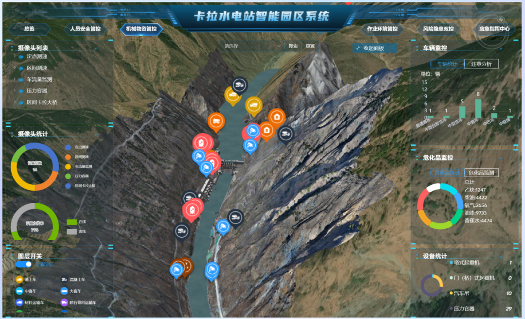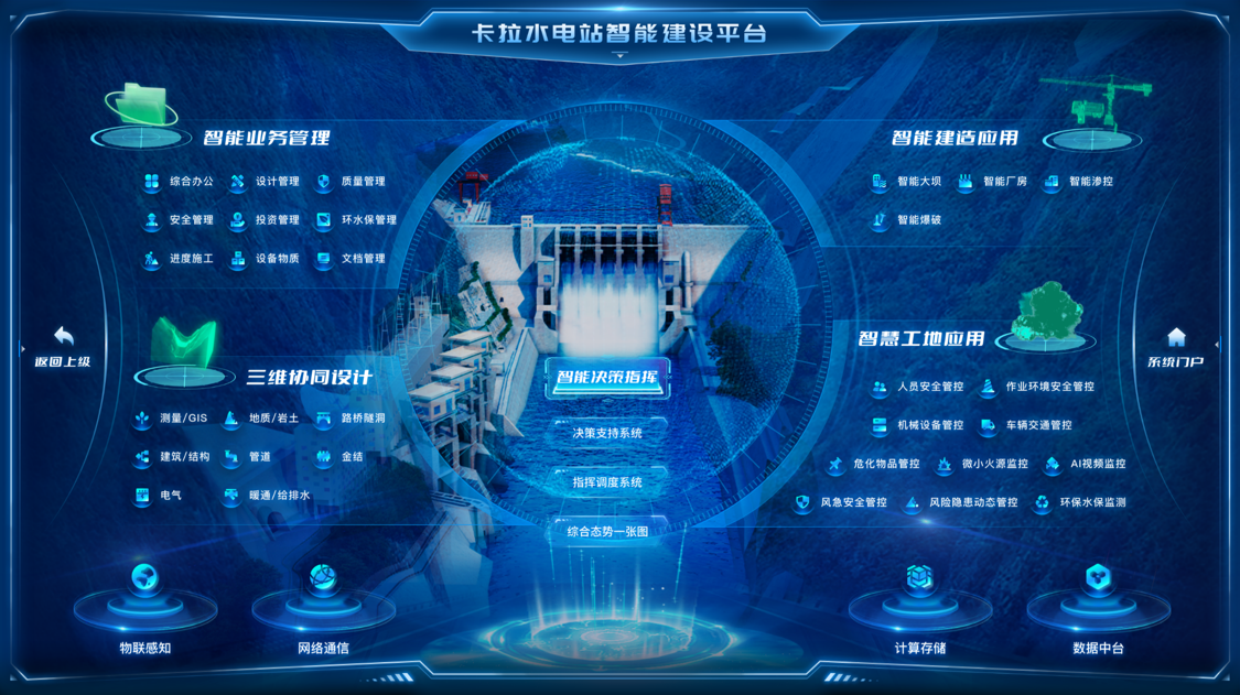 卡拉水电站位于凉山州木里县雅砻江中游规划第7级水电站,为碾压混凝土重力坝,最大坝高123米,总装机1020兆瓦,电站智能建设平台实现了电站建设的数字化和智能化,主要包括智能业务管理、三维协同设计、智能建造应用、智慧工地应用、智能决策指挥。