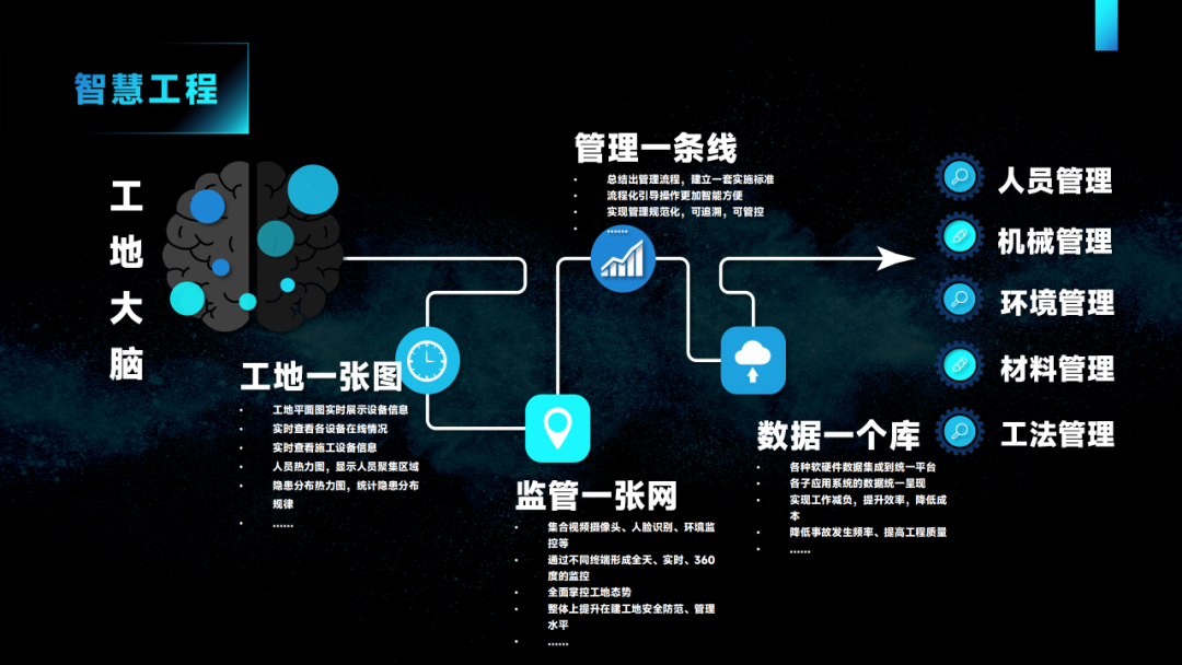 智慧工地集成了物联网、大数据、云计算、人工智能等先进技术,运用实时监控、智能预警等多种技术手段,可实现对电力工程建设项目的全方位、精细化、智能化管理,能够有效降低安全事故风险,保障施工人员的生命安全,提高工程建设的效率、质量,降低建设成本,并推动绿色建造和可持续发展。
