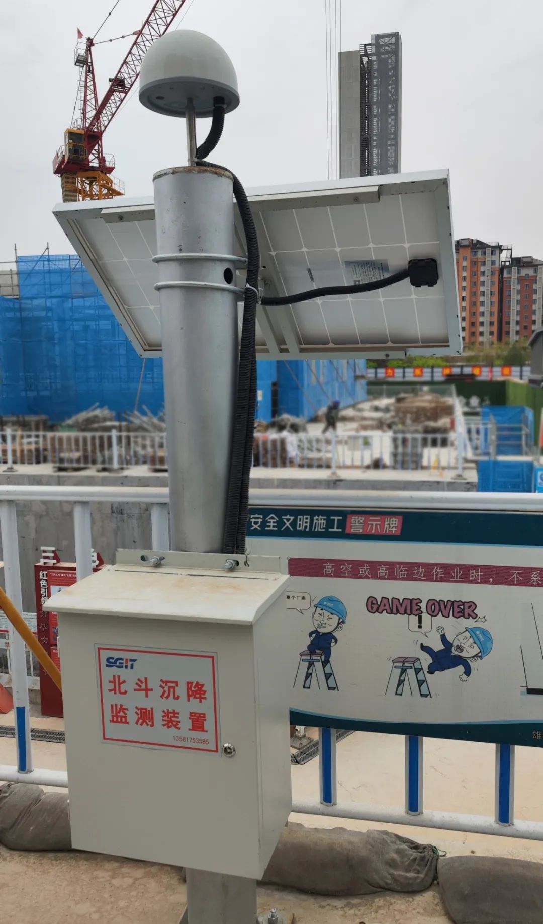 在主体结构施工阶段,作为工程的建设管理单位国网河北建设公司,还自主探索研究基于北斗高精度定位技术的深基坑实时监测和预警技术,创新部署应用“北斗+沉降”监测装置,实时测量施工现场及周边建筑沉降情况,实现了对基坑、地表及周围建筑物的实时全天候自动化高精度监测。