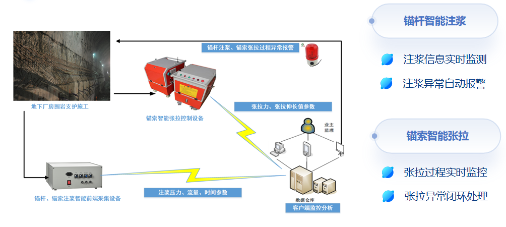 智能锚固综合集成三维地质建模及可视化分析技术、安全监测技术、物联网技术、智能监控技术,针对典型部位的锚杆和锚索,对施工过程信息进行动态采集与监控,提高施工质量和效果。