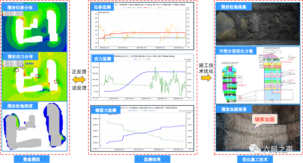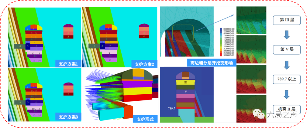 特大地下洞室群开挖支护全过程模拟分析:针对乌东德右岸特大规模地下洞井群开挖规模大、变形控制难、施工效率低等问题,采用数值仿真技术模拟了特大地下洞井群开挖的全过程,建立了“监控、量测、分析、反馈”的洞井群开挖变形控制预警系统。通过跟踪预报地下洞井群围岩的稳定与变形情况,动态指导洞室围岩支护设计与施工,实现了特大地下洞井群开挖全过程变形的动态控制。