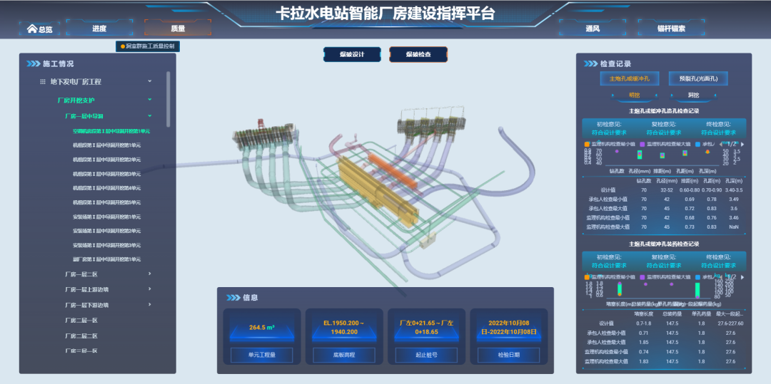 以电站三维模型为载体,利用BIM技术,构建数字孪生电站,智慧采集、分析施工过程数据,实现对电站建设过程的智能化监控。实现了对隐蔽工程施工质量的可视化管理,应用三维激光扫描仪对洞室开挖、支护、衬砌分阶段扫描,分析洞室超欠挖成效并统计衬砌混凝土用量;应用全景相机采集单元工程现场验收影像,完善质量验评资料并实现全景漫游效果。基建期结束后,平台汇集形成一套数字化资产移交使用。