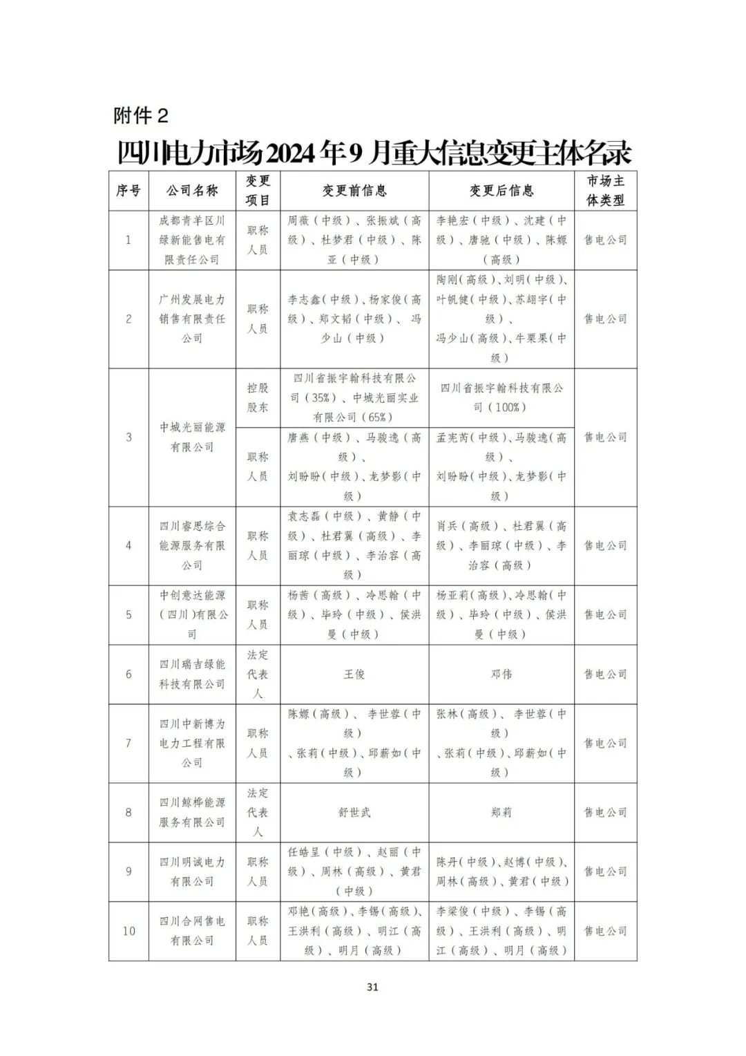 2024年9月,四川电力市场新增注册生效市场主体共1118家,其中发电企业1家,售电公司11家,电力用户1106家。重大信息变更市场主体共18家,其中售电公司10家,电力用户8家。注销市场主体1家,为售电公司。