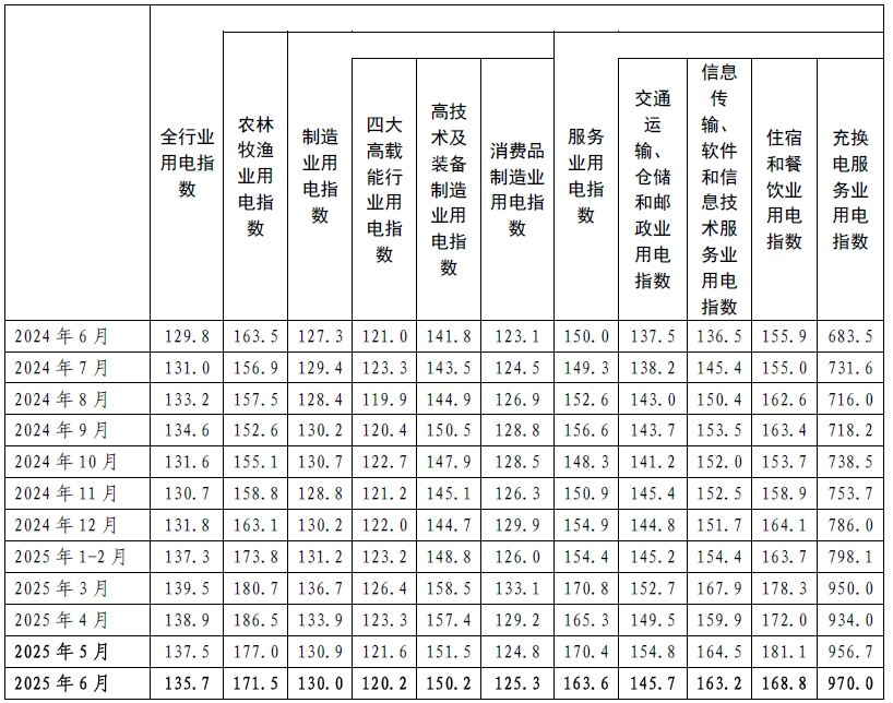2025年6月,全国全行业用电指数为135.7,全行业用电量比2020年基期(以2020年基期为100)增长了35.7%,年均增长6.3%,同比增长4.5%,增速比上月提高0.8个百分点。