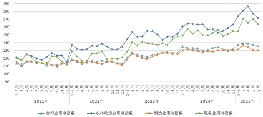 6月,农林牧渔业用电指数为171.5,比2020年基期增长了71.5%,年均增长11.4%,同比增长4.9%,增速比上月回落3.5个百分点。