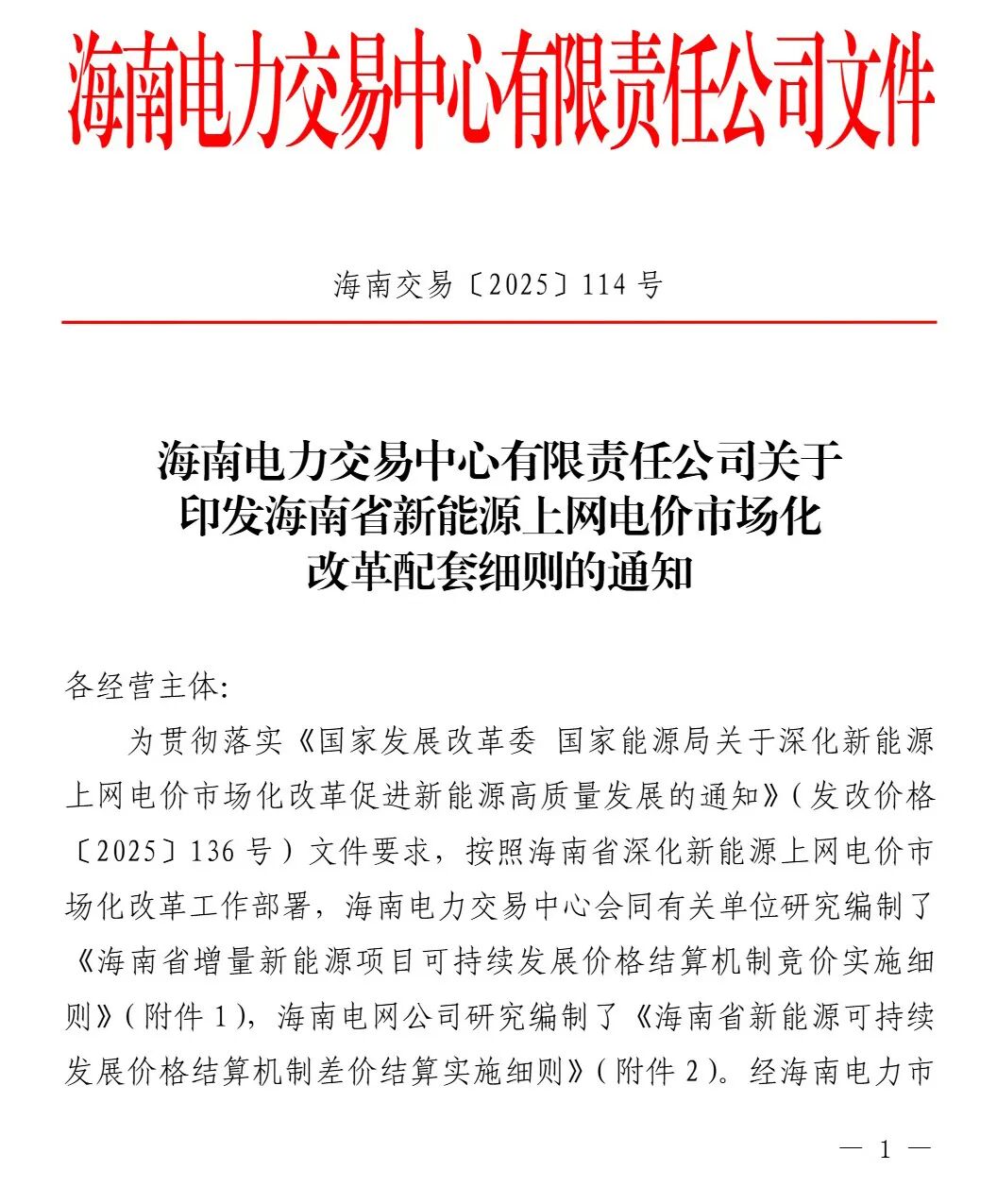 11月3日,海南电力交易中心印发海南省新能源上网电价市场化改革配套细则的通知,实施细则提到,适用于2025年6月1日及以后投产的且未纳入机制执行范围的新能源项目(风电、太阳能发电项目,下同)。