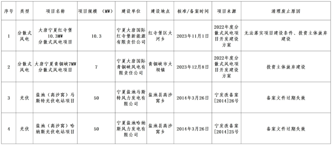 按照自治区发展改革委《关于清理废止不具备建设条件新能源项目的通知》(宁发改能源〔2025〕173号)要求,我委组织各县(市、区)发展改革局、园区开展相关工作,经各地梳理报送,吴忠市清理废止不具备建设条件新能源项目共4个,分别是红寺堡区大唐宁夏红寺堡10.3MW分散式风电项目、青铜峡市大唐宁夏青铜峡7MW分散式风电项目、盐池县盐池(高沙窝)哈纳斯光伏电站项目和盐池(高沙窝)马斯特光伏电站项目。