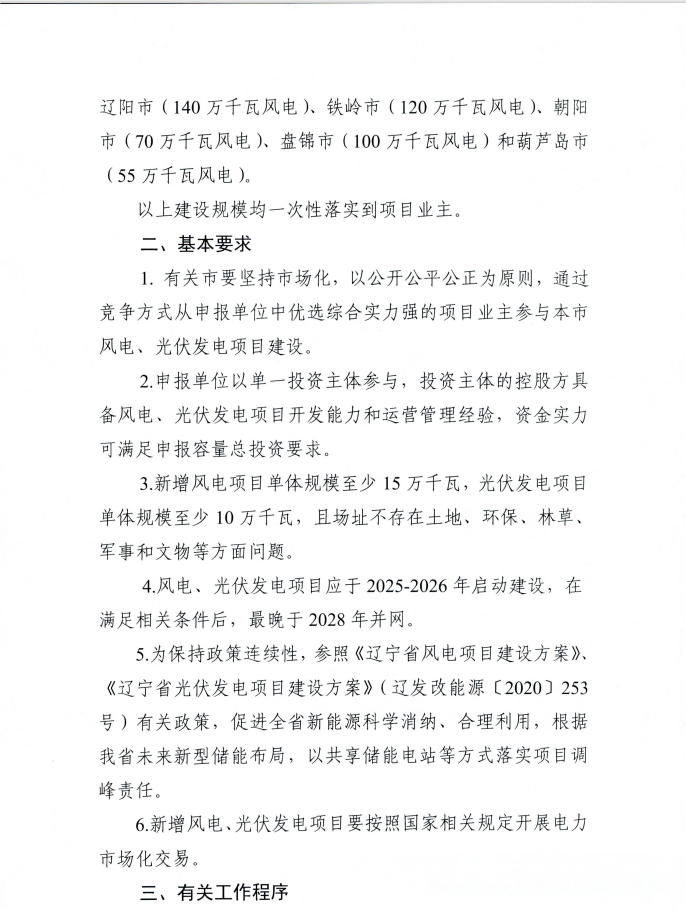 第二批风电、光伏发电项目建设规模1270万千瓦,其中风电970万千瓦,光伏发电300万千瓦,全部用于支持无补贴风电光伏项目建设。1270万千瓦建设规模分解下放到沈阳市(140万千瓦风电)、大连市(300万千瓦滩涂光伏)、抚顺市(95 万千瓦风电 )、锦州市(130万千瓦风电)、阜新市(120 万千瓦风电)辽阳市(140 万千瓦风电)、铁岭市(120万千瓦风电)、朝阳市(70万千瓦风电)、盘锦市(100万千瓦风电)和葫芦岛市(55 万千瓦风电)。
