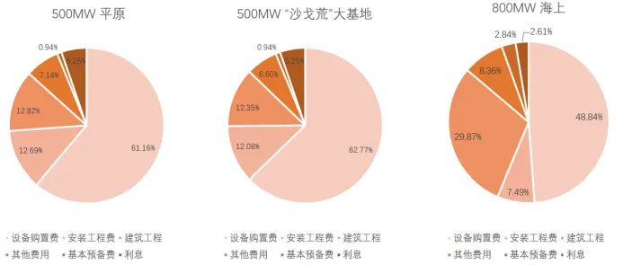 可以看到,设备购置费占整个项目的比例是最大的,高达50%—60%。随着地形的复杂程度变大,设备购置费的占比下降。相比于陆上风电项目,海上风电项目由于施工条件复杂、难度高,施工所需专业可用的大型船机设备较少(如海上风电机组基础打桩、风电机组吊装等)建安费用占总投资成本的比重大。