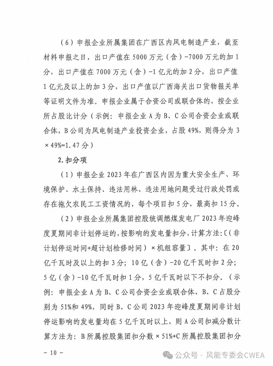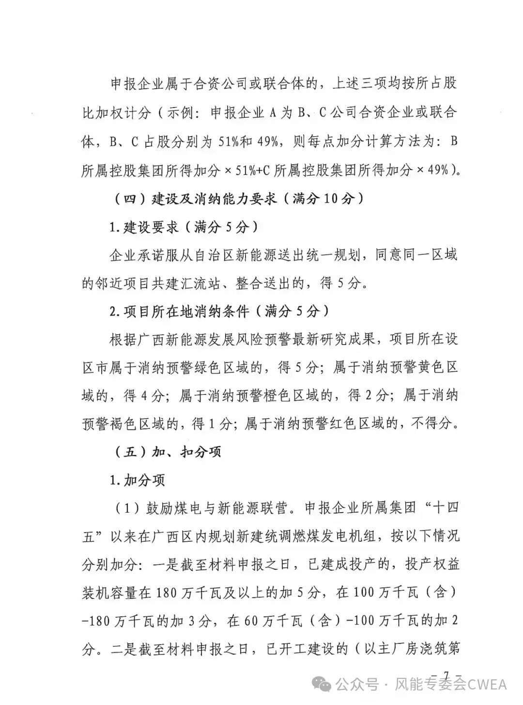 竞争性配置评分办法,评分指标包括企业能力(企业建设经验、企业投资能力),前期工作情况,项目的社会经济效应(支持乡村振兴战略实施、保障广西电力供应安全),建设及消纳能力要求等。加分项包括,鼓励煤电与新能源联营,按申报企业集团公司控股燃气发电厂2023年迎峰度夏和度冬顶峰指令期间所有机组加权平均最高出力负荷率赋分,申报企业所属集团在广西区内落户风电核心制造产业等6项。扣分项包括申报企业2023年在广西区内因为重大安全生产、环境保护、水土保持、违法用林、违法用地问题受过行政处罚或存在拖欠农民工工资情况的。申报企业获得广西2020年度建设指标且已核准的风电项目未全容量并网的等4大项。