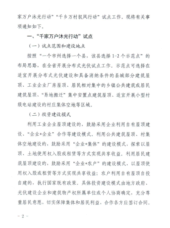 “千家万户沐光行动”试点:一个市州选择一个县,一个县选择1-2个示范点。单点建设规模应小于6兆瓦。所发电量可采用“全额自发自用”“自发自用、余量上网”“全额上网”等多种方式。探索分布式光伏分时上网电价机制,推动分布式光伏上网参与市场。