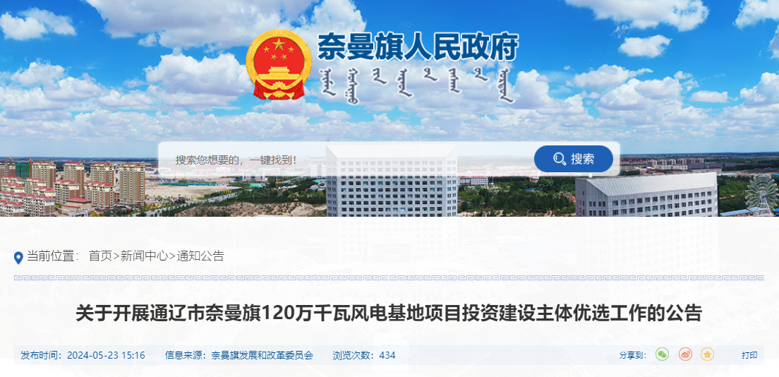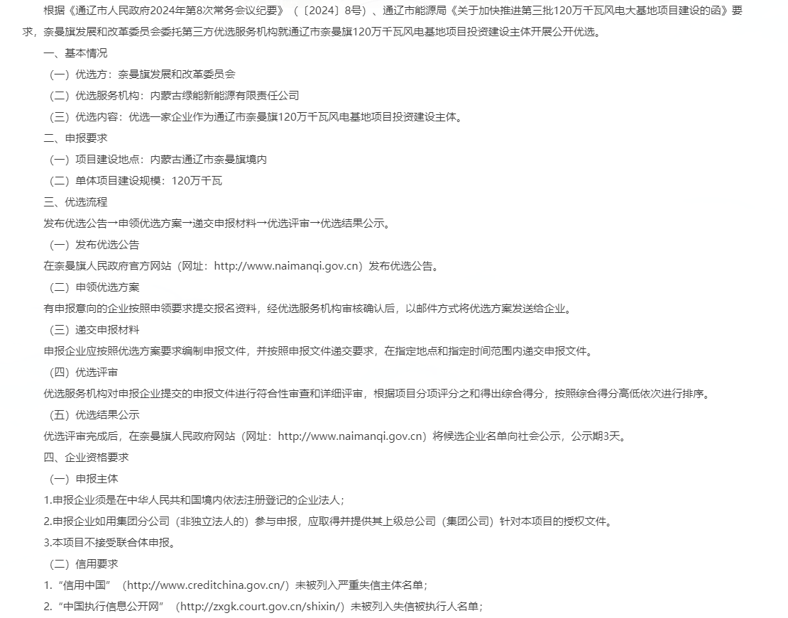 近日,内蒙古通辽市奈曼旗人民政府发布关于开展通辽市奈曼旗120万千瓦风电基地项目投资建设主体优选工作的公告。