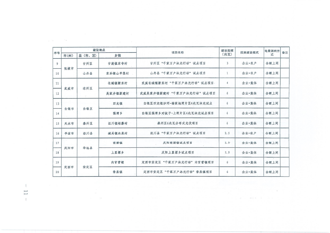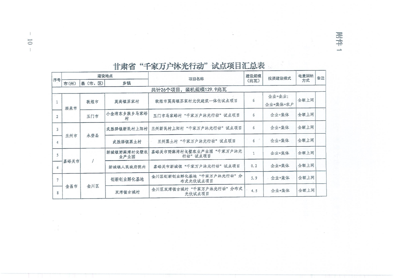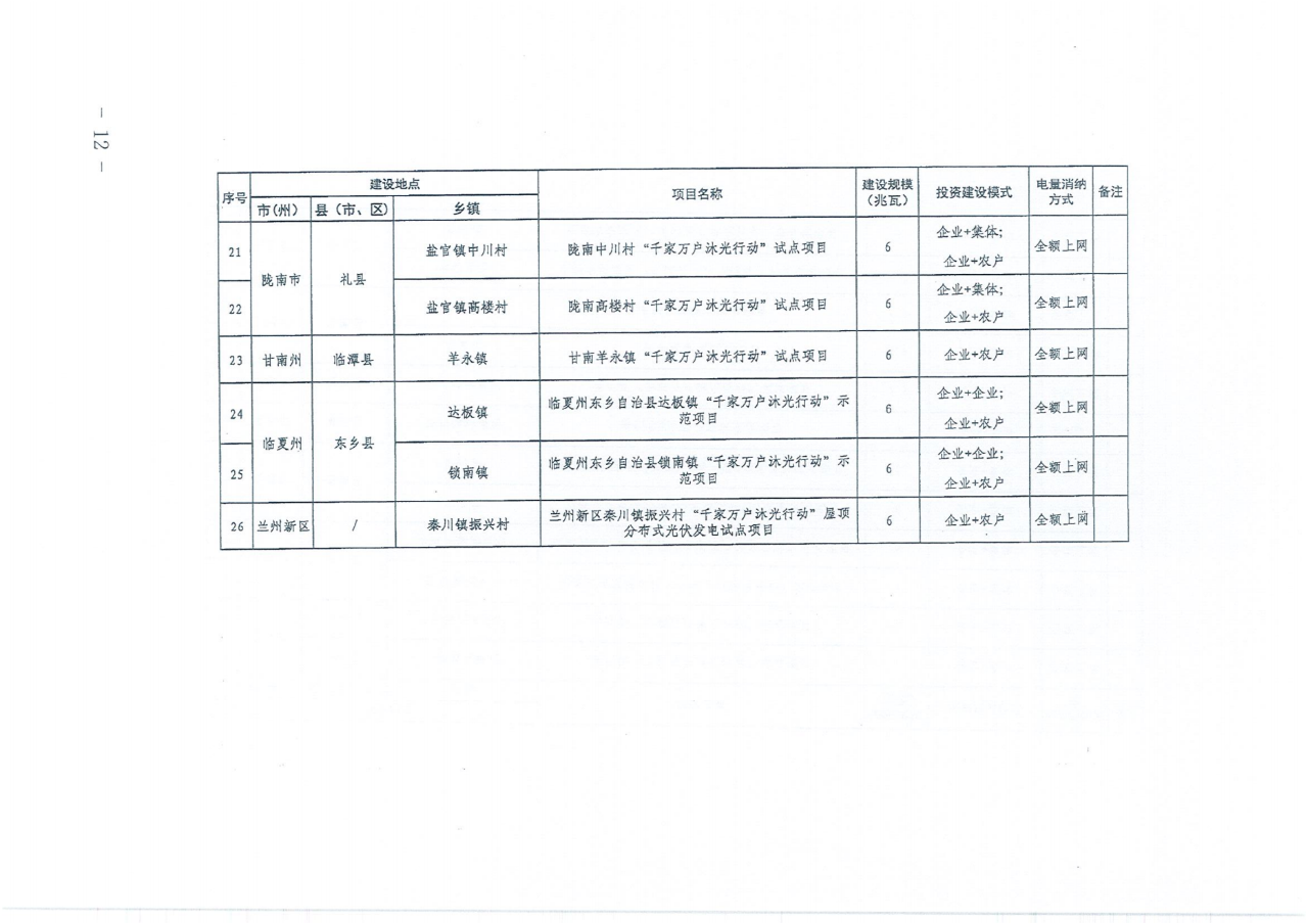 《通知》指出,甘肃“千家万户沐光行动”“千乡万村驭风行动”试点项目共51项,总装机规模619.9兆瓦。其中“千家万户沐光行动’试点项目26项,装机规模129.9兆瓦,消纳方式均为全额上网;“千乡万村驭风行动”试点项目25项,装机规模490兆瓦,消纳方式均为全额上网。