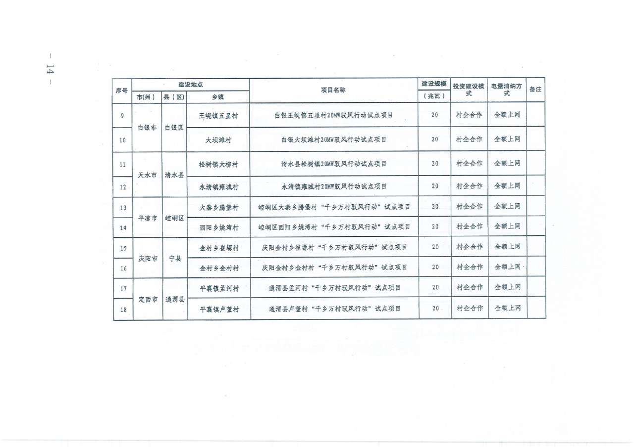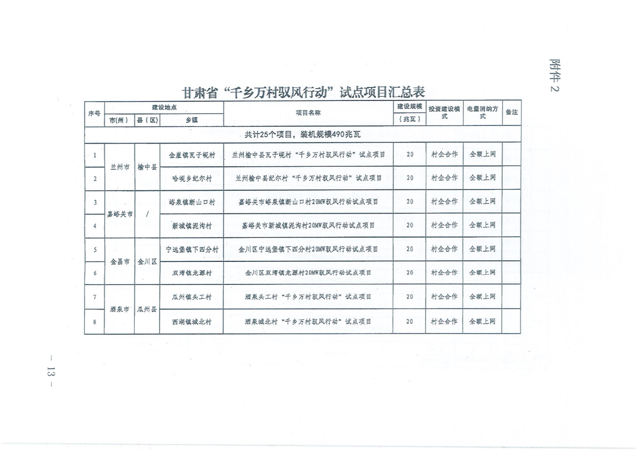 布局和规模。按照“试点先行,条件成熟一个实施一个”的原则,在每个市选择一个县,每个县选1-2个行政村,确定甘肃省“千乡万村驭风行动”试点项目25项,装机规模490兆瓦,涉及除武威、张掖以外12个市州和兰州新区的榆中县、金川区、瓜州县、白银区、清水县、崆峒区、宁县、通渭县、宕昌县、夏河县、永靖县等11个县(区)25个行政村。