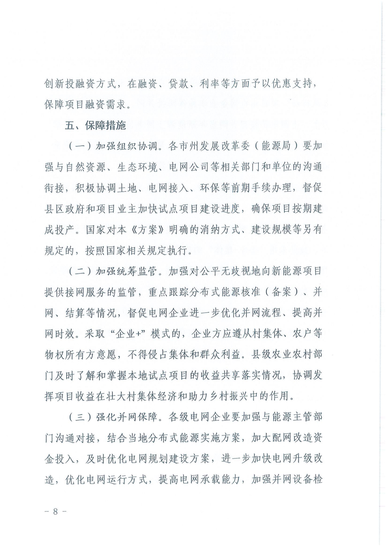 此外,加强对公平无歧视地向新能源项目提供接网服务的监管,重点跟踪分布式能源核准(备案)、并网、结算等情况,督促电网企业进一步优化并网流程、提高并网时效。采取“企业+”模式的,企业方应遵从村集体、农户等物权所有方意愿,不得侵占集体和群众利益。县级农业农村部门及时了解和掌握本地试点项目的收益共享落实情况,协调发挥项目收益在壮大村集体经济和助力乡村振兴中的作用。