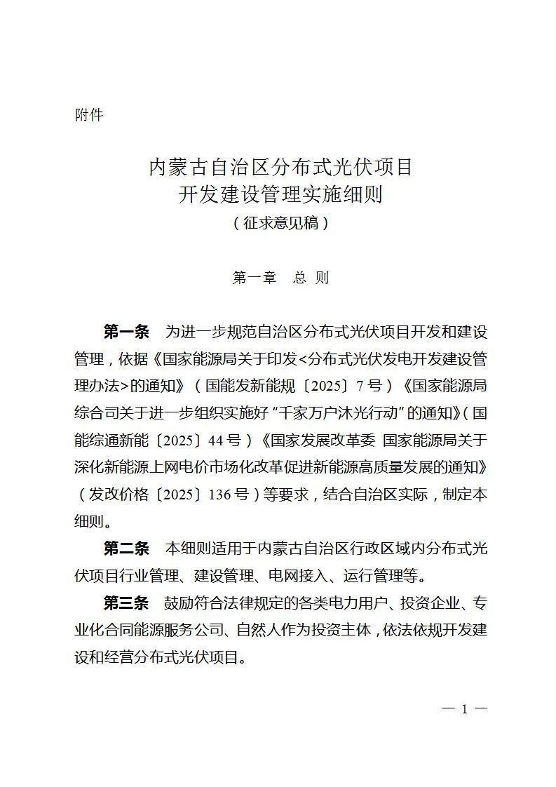 关于公开征求《内蒙古自治区分布式光伏项目开发建设管理实施细则(征求意见稿)》意见的公告