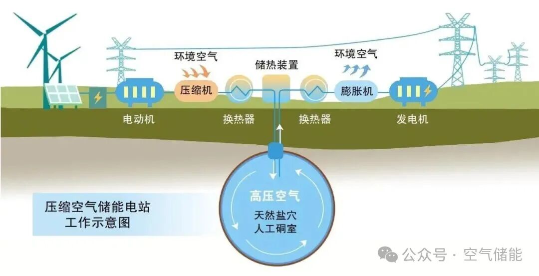 压缩空气储能的工作原理是利用用电低谷期的电能通过压缩机压缩空气,把电能转换成空气压力能和一部分热能储存到储气库中,实现能量的存储;在用电高峰期,从储气库中释放出的高压空气经加热升温后通过膨胀机做功,转化为机械能,进而带动发电机发电,实现能量的释放。