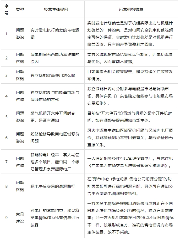 会上交易中心对广东电力市场运营情况进行了通报。各经营主体积极讨论、建言献策,对实时发电执行偏差的考核逻辑等方面进行了咨询,对增加交易品种等提出意见建议。运营机构对咨询问题逐一回应,并就经营主体提出的意见建议进行了充分的沟通与讨论,具体内容详见附表。